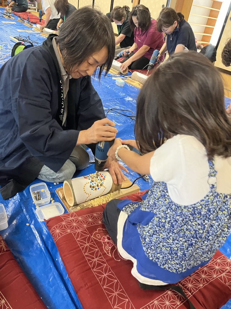 医王寺では竹灯籠づくりを体験し、竹にドリルで穴を開けながらオリジナルの作品を作成する楽しさを味わいました。