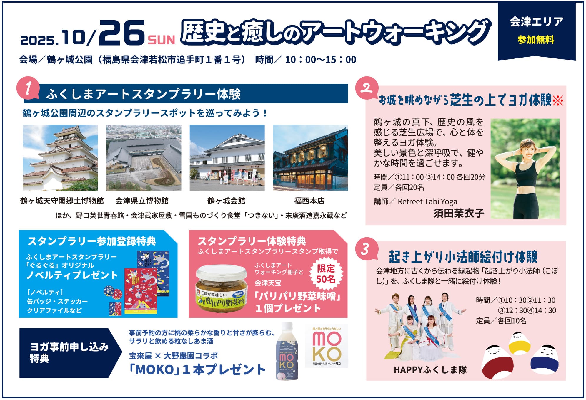 そのほか、HAPPYふくしま隊による起き上がり小法師の絵付け体験や、鶴ヶ城の周辺施設を巡るスタンプラリーなど、会津の歴史や文化に触れながら楽しめる企画も実施しました。