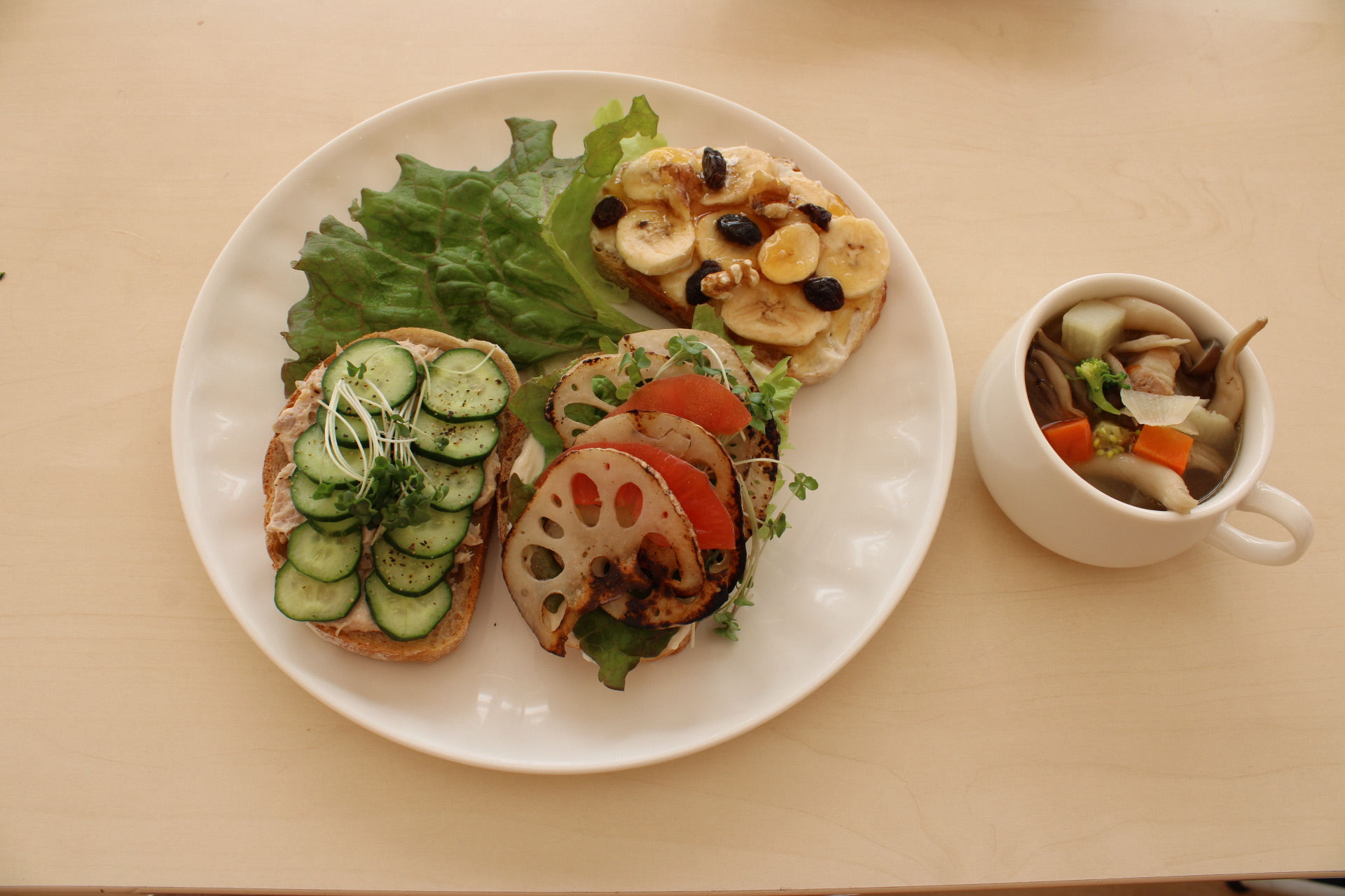 大人の食育講座では、豆腐を使ったマヨネーズの作り方を教わりました。ヘルシーさと美味しさを合わせ持ったマヨネーズは、罪悪感なく楽しめるとのことで、参加者の皆さんには大変好評でした。また、アレンジメニューとして、お豆腐マヨのオープンサンドも作りました。素敵なランチタイムになったとの感想もいただきました。