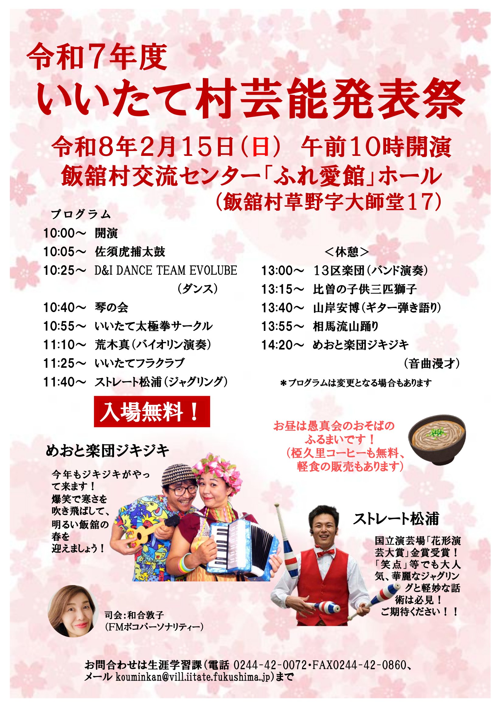 村のみなさんが日頃の練習の成果を披露する「いいたて村芸能発表祭」、今年も民俗芸能やさまざまなサークルなど、去年に引き続き盛りだくさんで開催します。