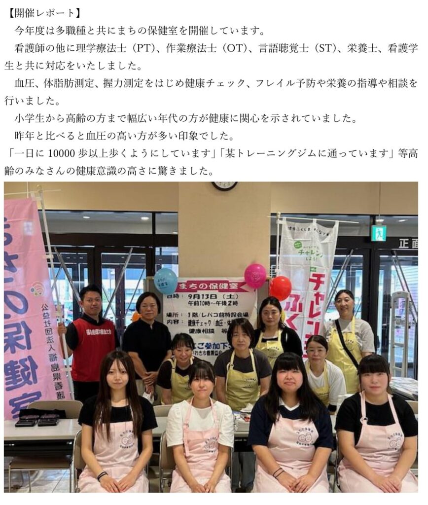 看護協会では、地域の皆さんの健康を支援するため、地域の交流の場に「まちの保健室」を開設し、