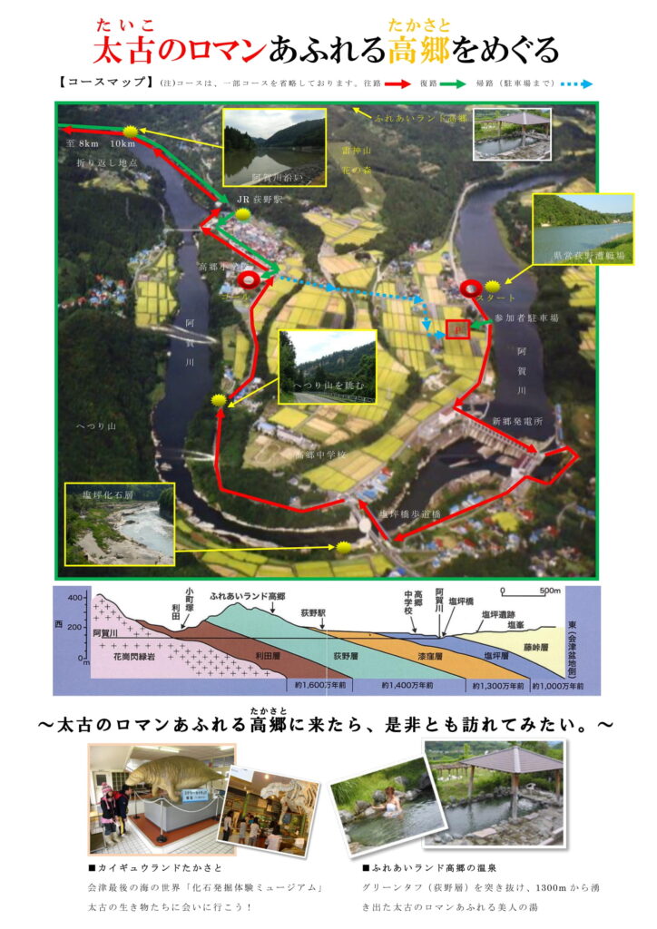 コースは、福島県内唯一の漕艇場で、国体を2度開催し「ボート、山を登る」と言われた県営荻野漕艇場をスタート、普段は入れない発電所の中を通り、雄大な阿賀川沿いを、折返し地点が異なる8キロと10キロのコースをウォーキングします。