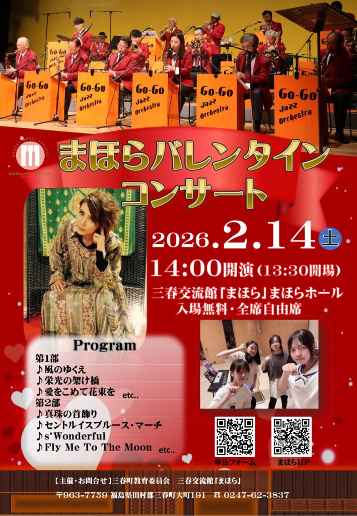 令和8年2月14日(土)14:00より三春交流館「まほら」にて「まほらバレンタインコンサート」を開催します。