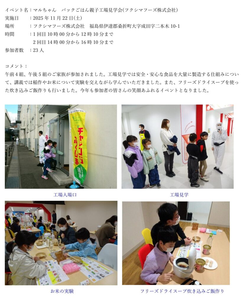 福島県伊達郡桑折町にあるフクシマフーズ株式会社にて、11月22日(土)に、小学生とその保護者を対象とした「マルちゃん パックごはん親子工場見学会」を開催いたします。
