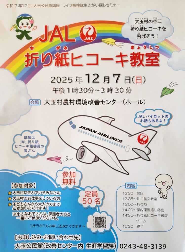ライフ探検隊生きがい探しセミナー「JAL折り紙ヒコーキ教室」 (大玉村)