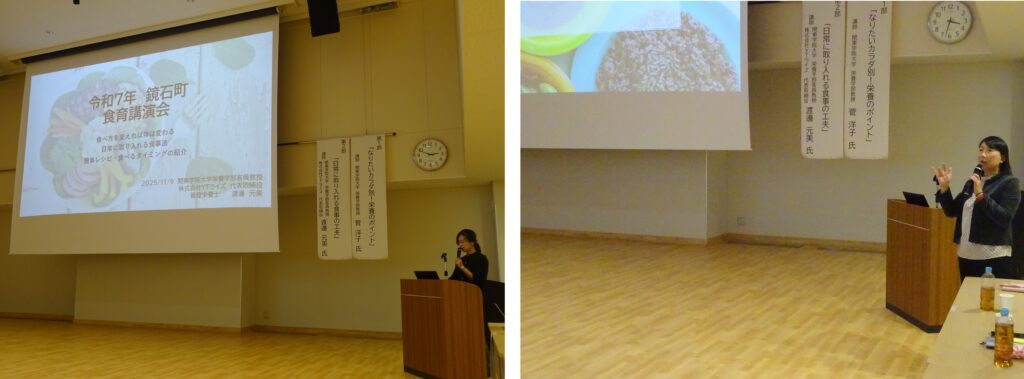 11月9日、鏡石町健康福祉センターにおいて、関東学院大学栄養学部 菅洋子教授、渡邊元美客員教授を招き、「食べ方を変えればカラダが変わる~なりたいカラダを作るための栄養学とその実践的な食事法~」と題し、食育講演会を開催しました。