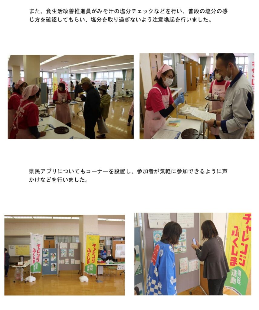 血圧や体脂肪測定、体力、塩分チェック等運動や食生活など健康づくりについて楽しく体験できるイベントです。