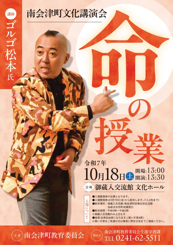 本町の基本理念「人を育むまち」「みんなが輝くまち」に基づいた魅力ある町づくりを目指し、町民憲章が示す「文化の薫り豊かなまちづくり」を推進するため、南会津町文化講演会を下記のとおり開催します。