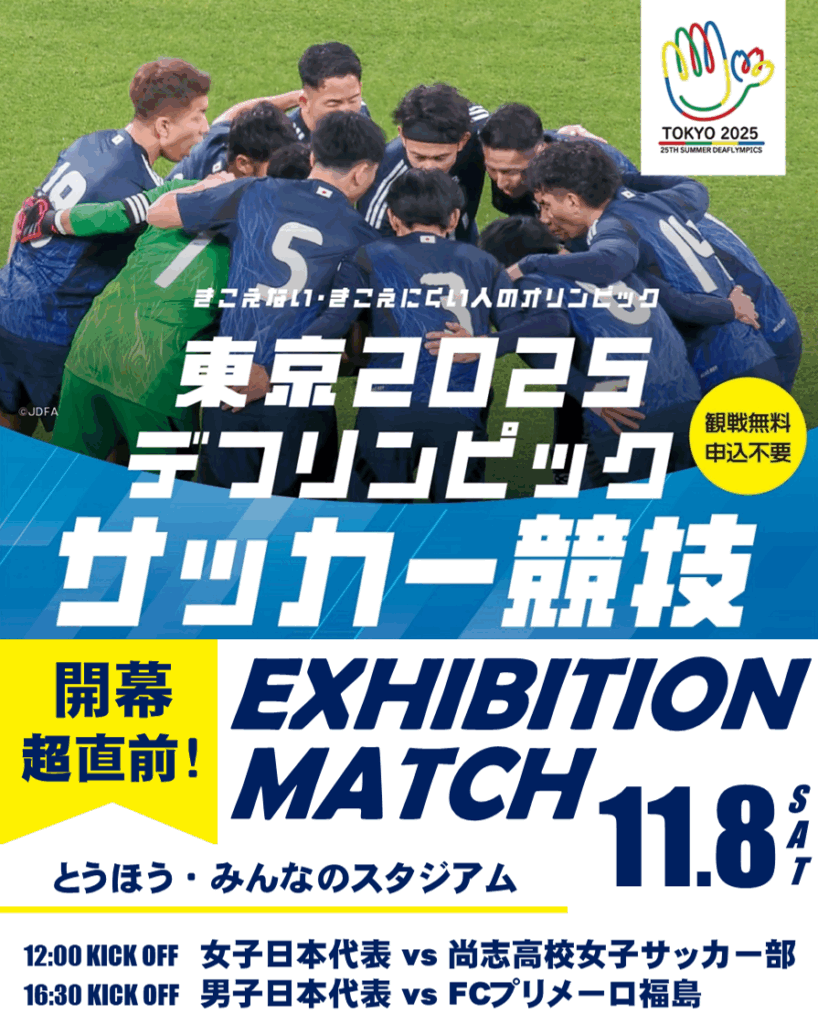 11月14日にJヴィレッジで開幕する、東京2025デフリンピックサッカー競技の応援ムードを最大限に引き上げるため、開幕直前イベントとしてエキシビションマッチを開催します!