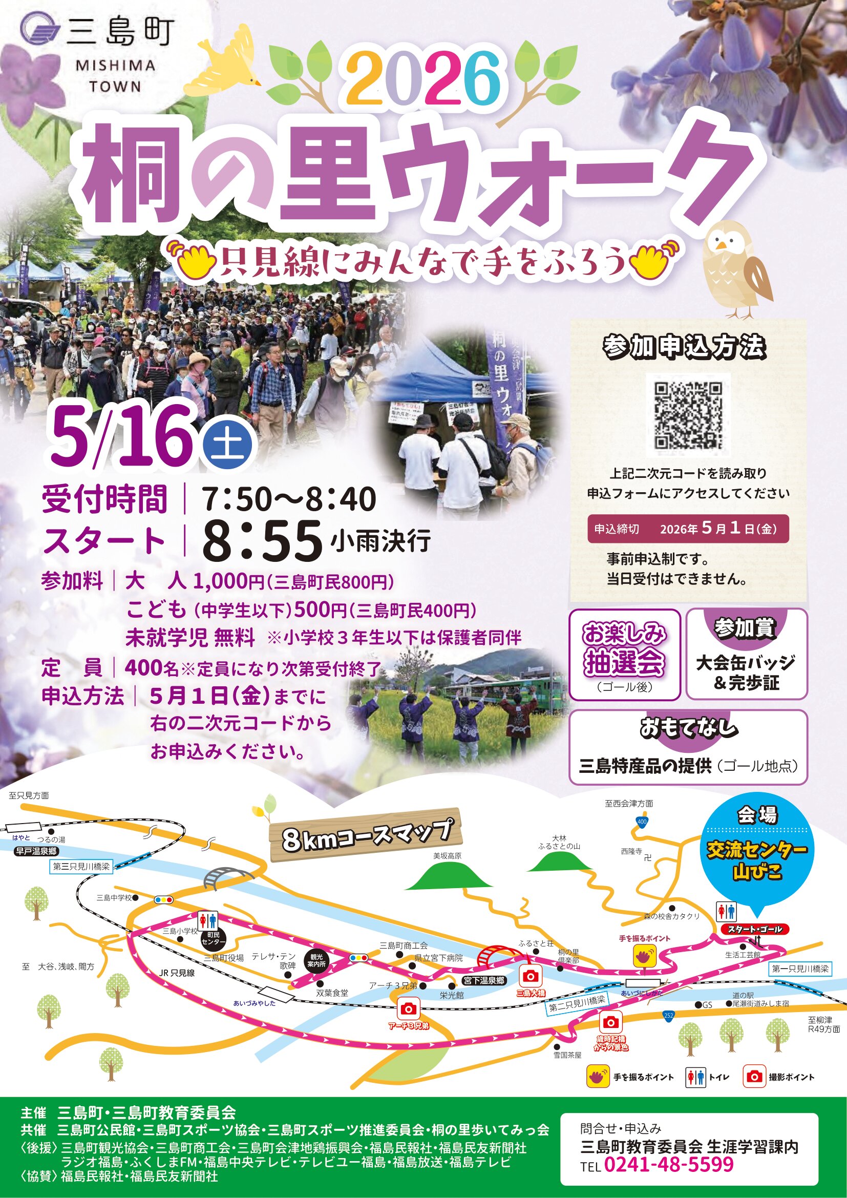 新緑の中、町内を楽しく歩くイベント「桐の里ウォーク2026~只見線にみんなで手を振ろう~」を開催します。