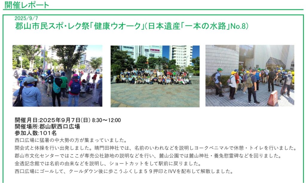 郡山市民スポ・レク祭で「健康ウオーク」部門で、日本遺産「一本の水路」の安積疏水の記念碑的建物や郡山の飛躍的発展の象徴を感じるコースを楽しく歩きます。