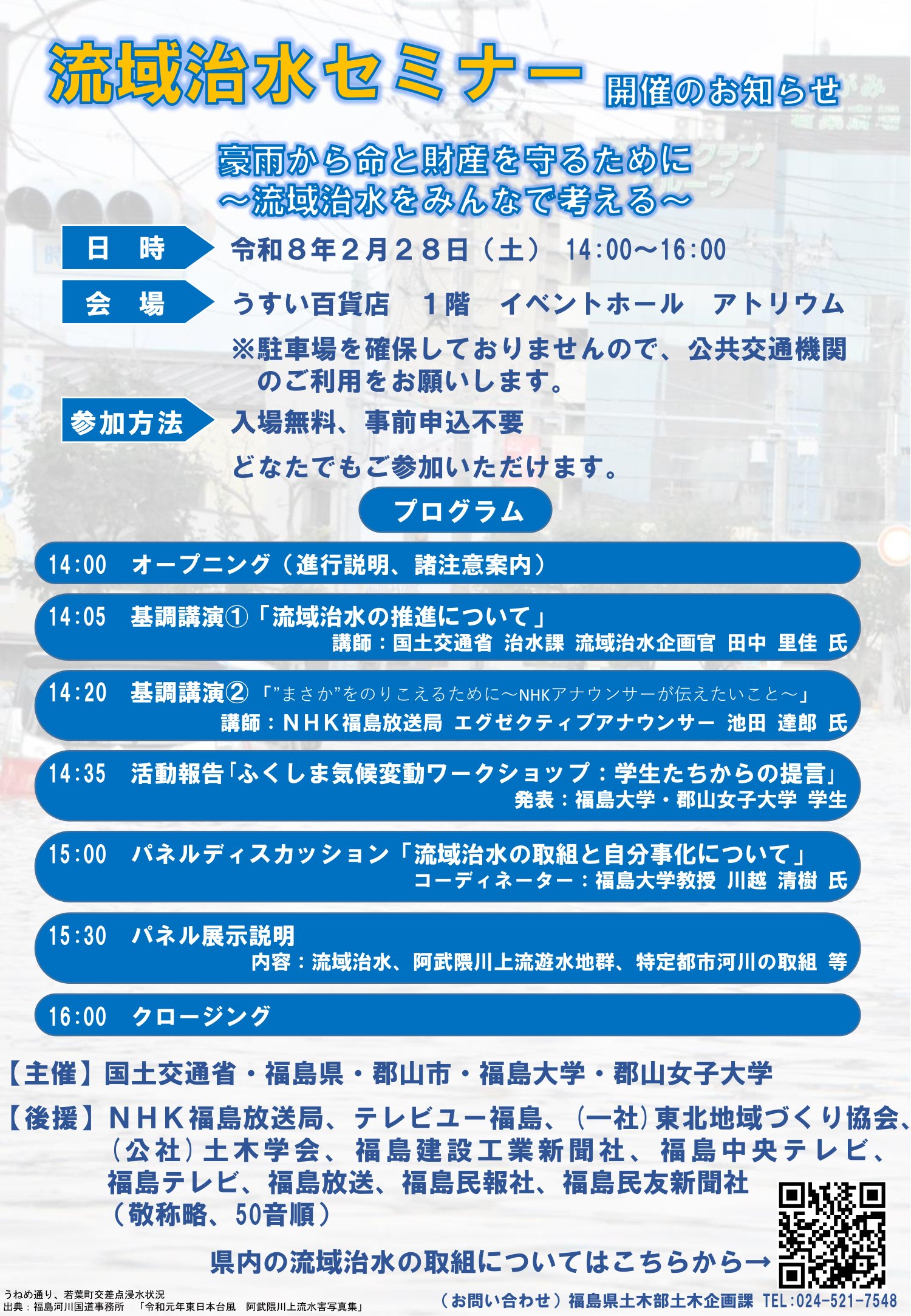 流域治水の基本的な考え方や逢瀬川及び谷田川の特定都市河川指定をはじめとした県内の流域治水の取組について流域住民へ紹介し、一人一人が水害対策を自分事として考える機会とすることを目的に、セミナーを開催します。