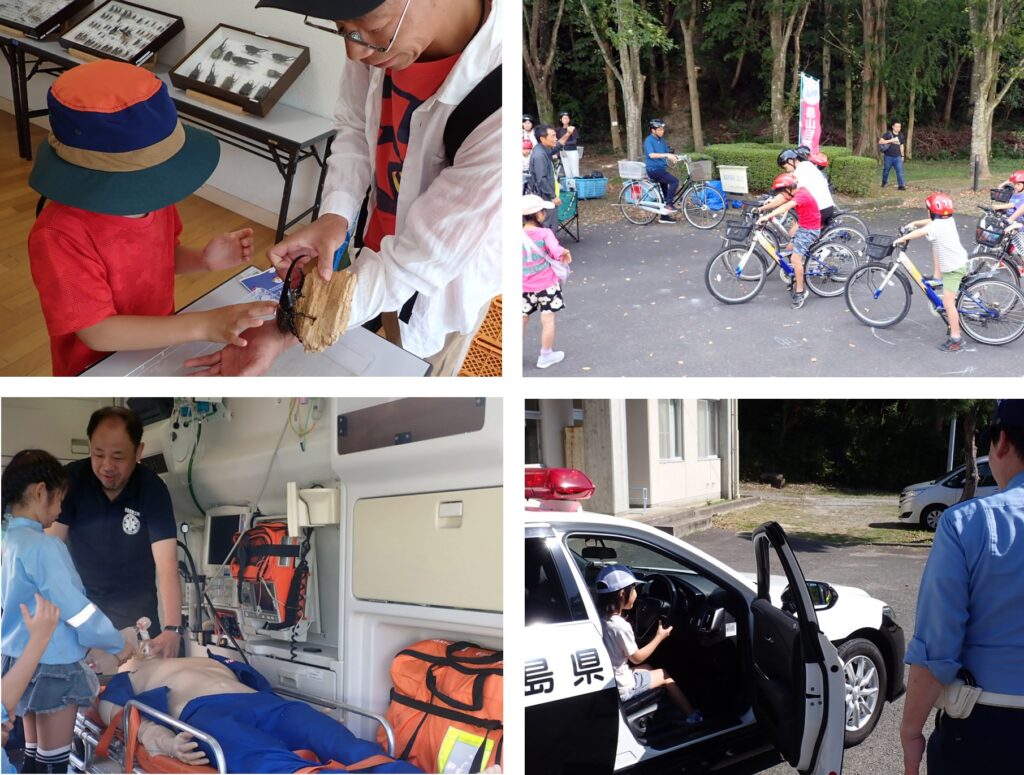 郡山自然の家のフィールド活動、FSGお仕事体験コーナー、人気のふわふわジャンボスライダー、白バイ&パトカーもやってきます!