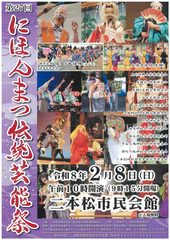 神楽や獅子舞、祭り囃子など、長い伝統に培われ、今日まで伝えられてきた二本松の民俗芸能に親しんでいただく催しです。