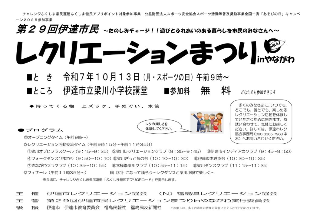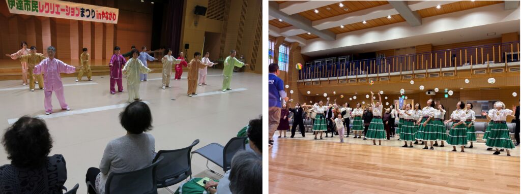 10月13日のスポーツの日に、伊達市レクリエーション協会では、ふくしま健民アプリポイント対象事業・全国一斉あそびの日キャンペーン参加事業「第29回伊達市民レクリエーションまつりinやながわ」を梁川小学校講堂で行いました。市民の皆さんがレクリエーションへ対する関心を高め、健康で明るくうるおいのある暮らしを応援するため、伊達市レクリエーション協会加盟団体が一堂に会し、日ごろの活動を発表し、活動内容を知ってもらうと同時に、お互いの活動を知り、加盟9団体の交流を深めました。当日は、伊達市はじめ近隣市町から約150人の参加がありました。
