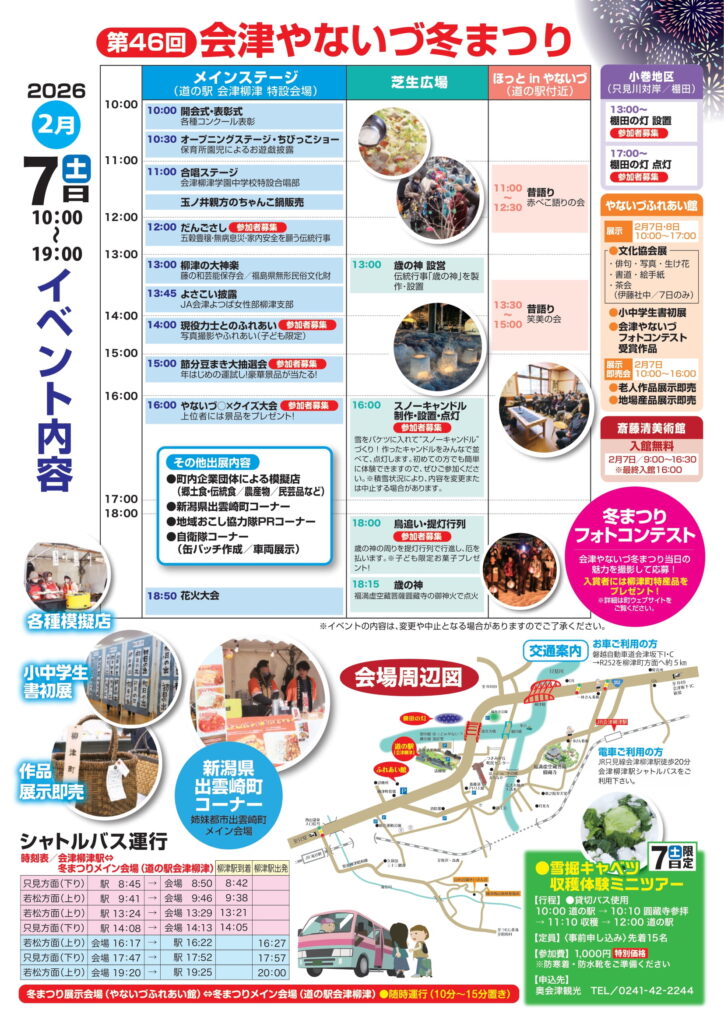 令和8年2月7日(土)に道の駅会津柳津をメイン会場に「第46回会津やないづ冬まつり」を開催いたします。