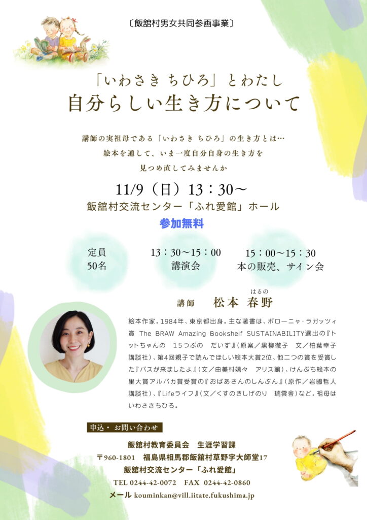 村では、絵本作家の松本春野氏を講師に迎え、男女共同参画事業として講演会を開催いたします。