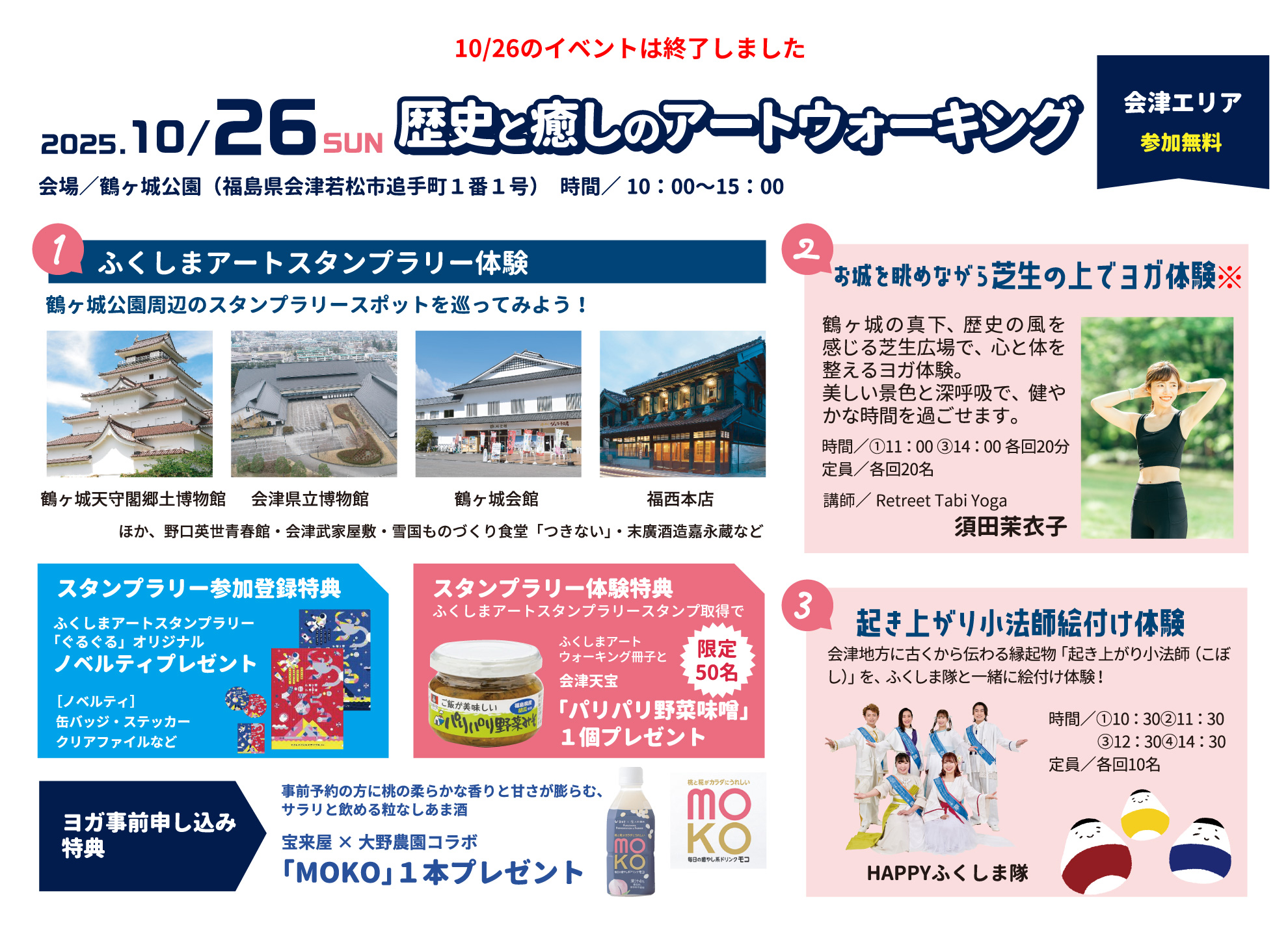 福島県には、美術館や博物館だけでなく、歴史的な街並みや伝統文化、 そして四季折々の自然が広がっています。 これらを「アート」として捉え、歩きながらその魅力を感じるのが 「ふくしまアートウォーキング」です。